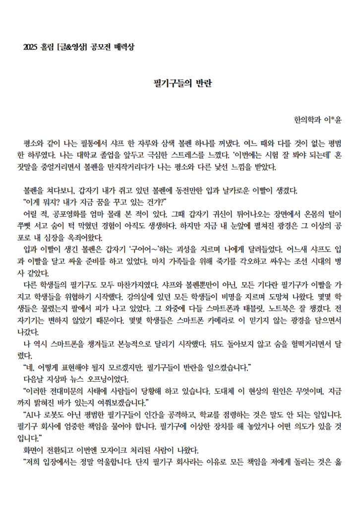 2025 홀림 [글&영상] 공모전 매력상 수상 작품 (필기구들의 반란 외)