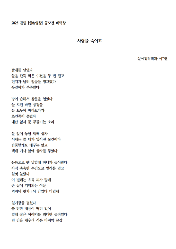 2025 홀림 [글&영상] 공모전 매력상 수상 작품 (끝없는 날개짓 외)
