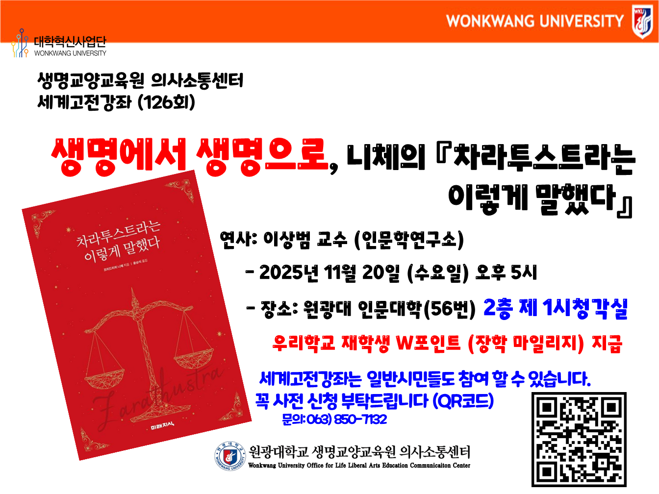 반갑습니다. 의사소통센터입니다. 오는 11월 19일(수) / 11월 20일(목) 오후 5시부터 인문대학 2층 제1시청각실에서 우리 대학 학생부터 교직원, 통합 원광대학교 구성원, 관심있는 일반시민 누구나 참여 가능합니다. 노쇼는 안되겠죠? 세계고전강좌 신청하기 클릭 (카메라로 큐알코드 접속 후 신청 가능)