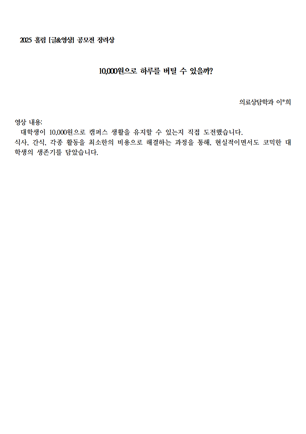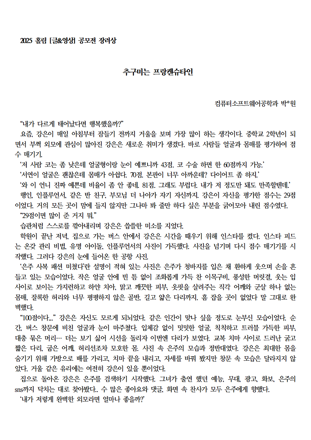 자료실 홈알림마당자료실 2025 홀림 [글&영상] 공모전 장려상 수상 작품 (추구미는 프랑켄슈타인 외) 2025 홀림 [글&영상] 공모전 장려상 수상 작품 (추구미는 프랑켄슈타인 외) 의사소통센터2026-01-23 페이스북 트위터 구글플러스 이메일 프린트 이전자료실다음
