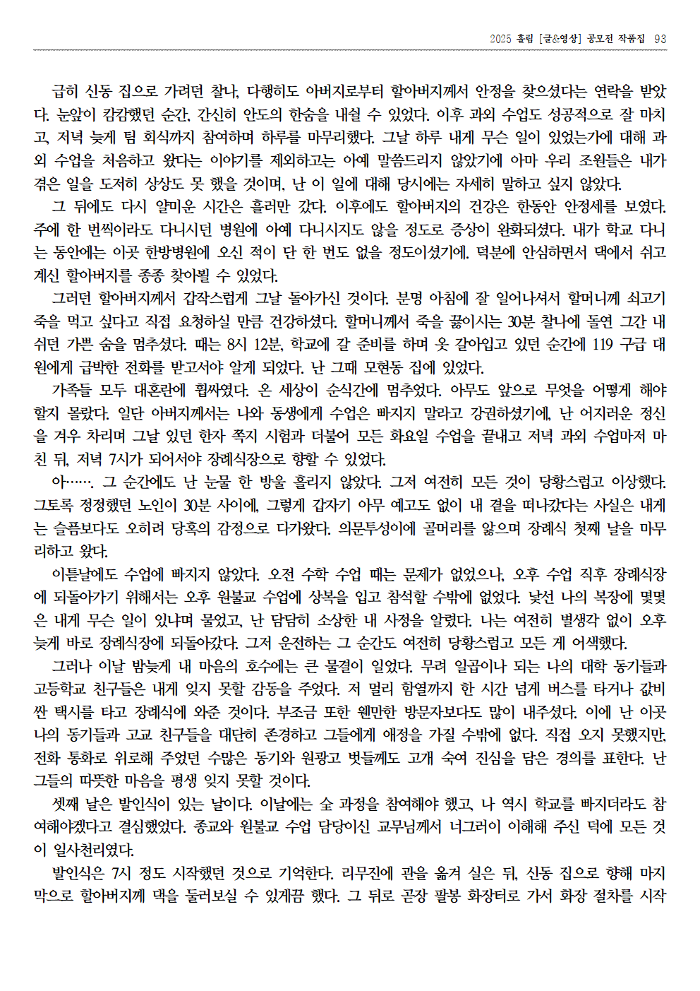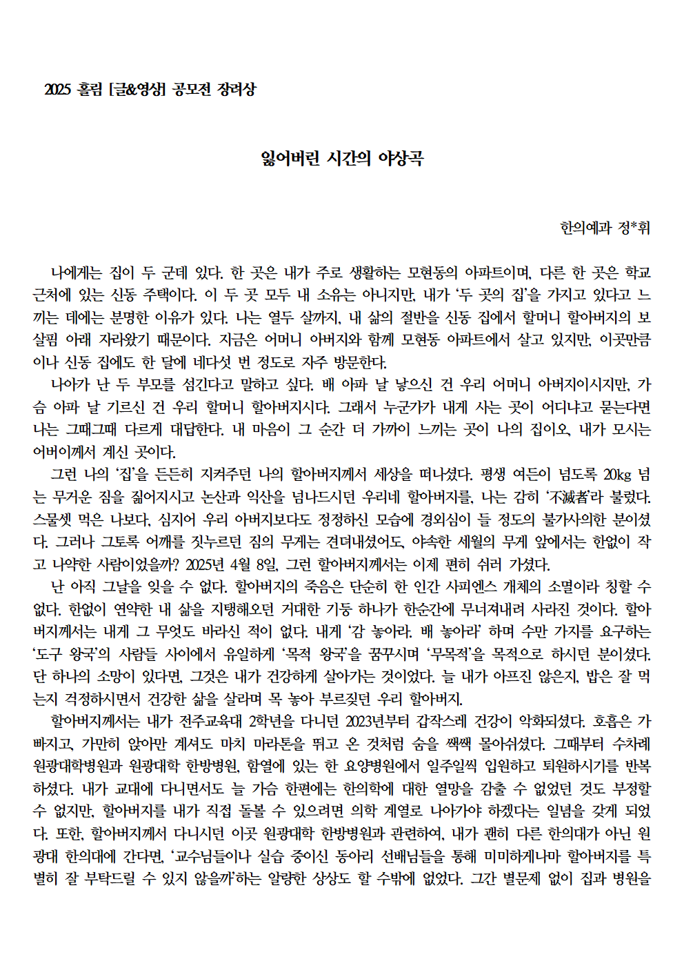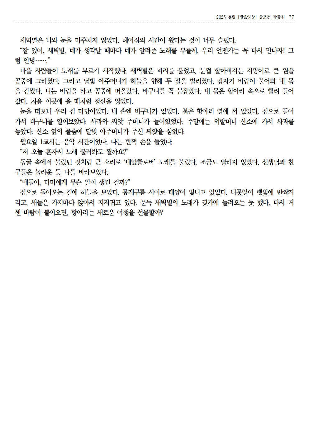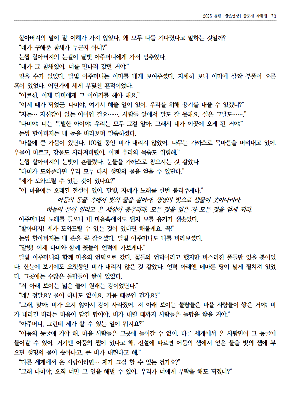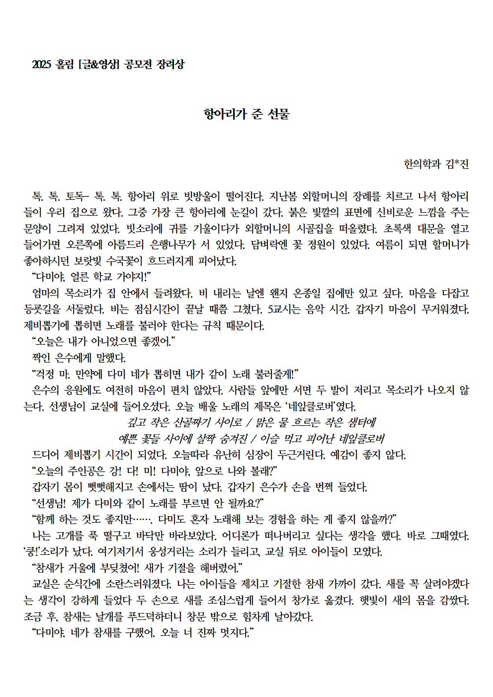 자료실 홈알림마당자료실 2025 홀림 [글&영상] 공모전 장려상 수상 작품 (항아리가 준 선물 외) 2025 홀림 [글&영상] 공모전 장려상 수상 작품 (항아리가 준 선물 외) 의사소통센터2026-01-23 페이스북 트위터 구글플러스 이메일 프린트 이전자료실다음