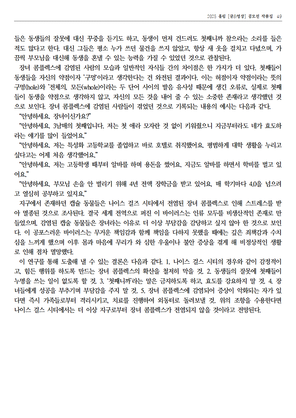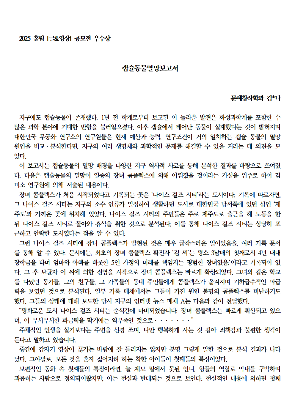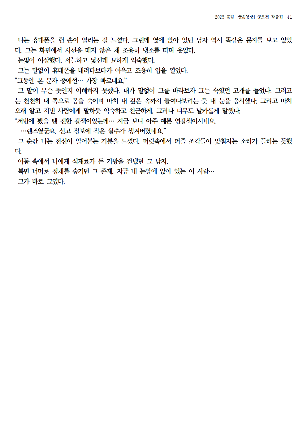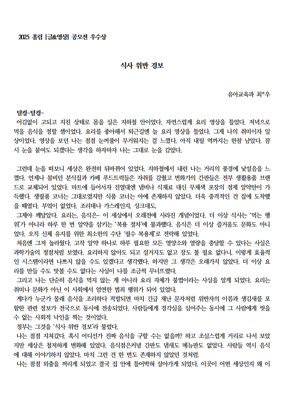 자료실 홈알림마당자료실 2025 홀림 [글&영상] 공모전 우수상 수상 작품 (식사 위반 경보 외) 2025 홀림 [글&영상] 공모전 우수상 수상 작품 (식사 위반 경보 외) 의사소통센터2026-01-23 페이스북 트위터 구글플러스 이메일 프린트 이전자료실다음