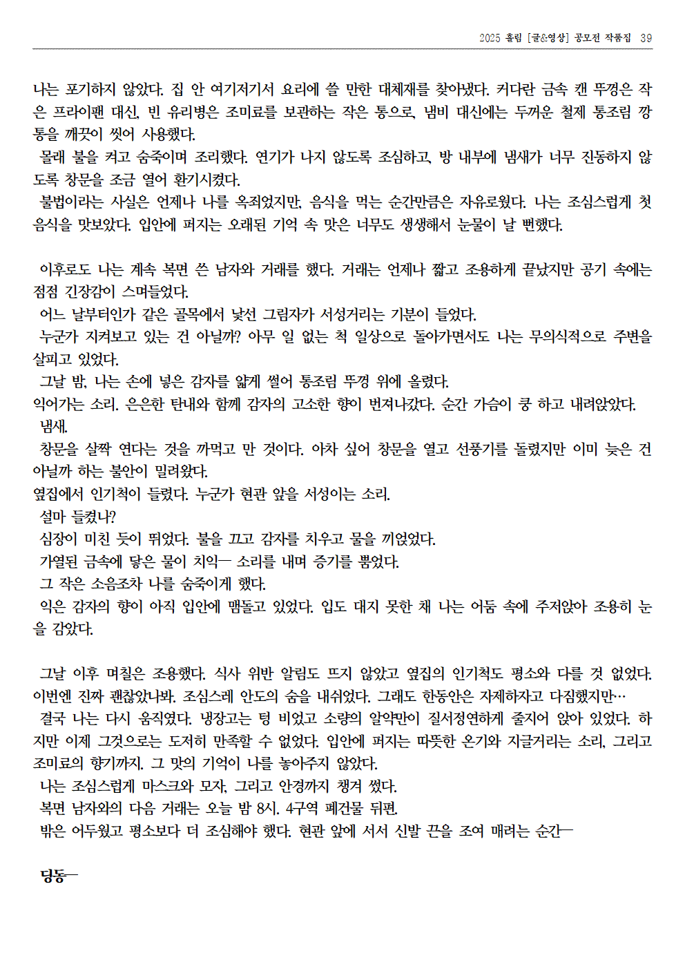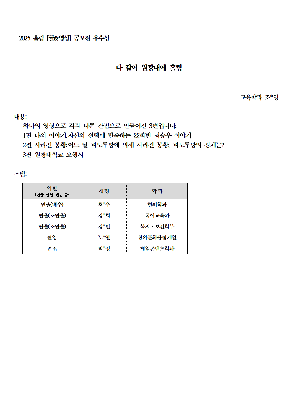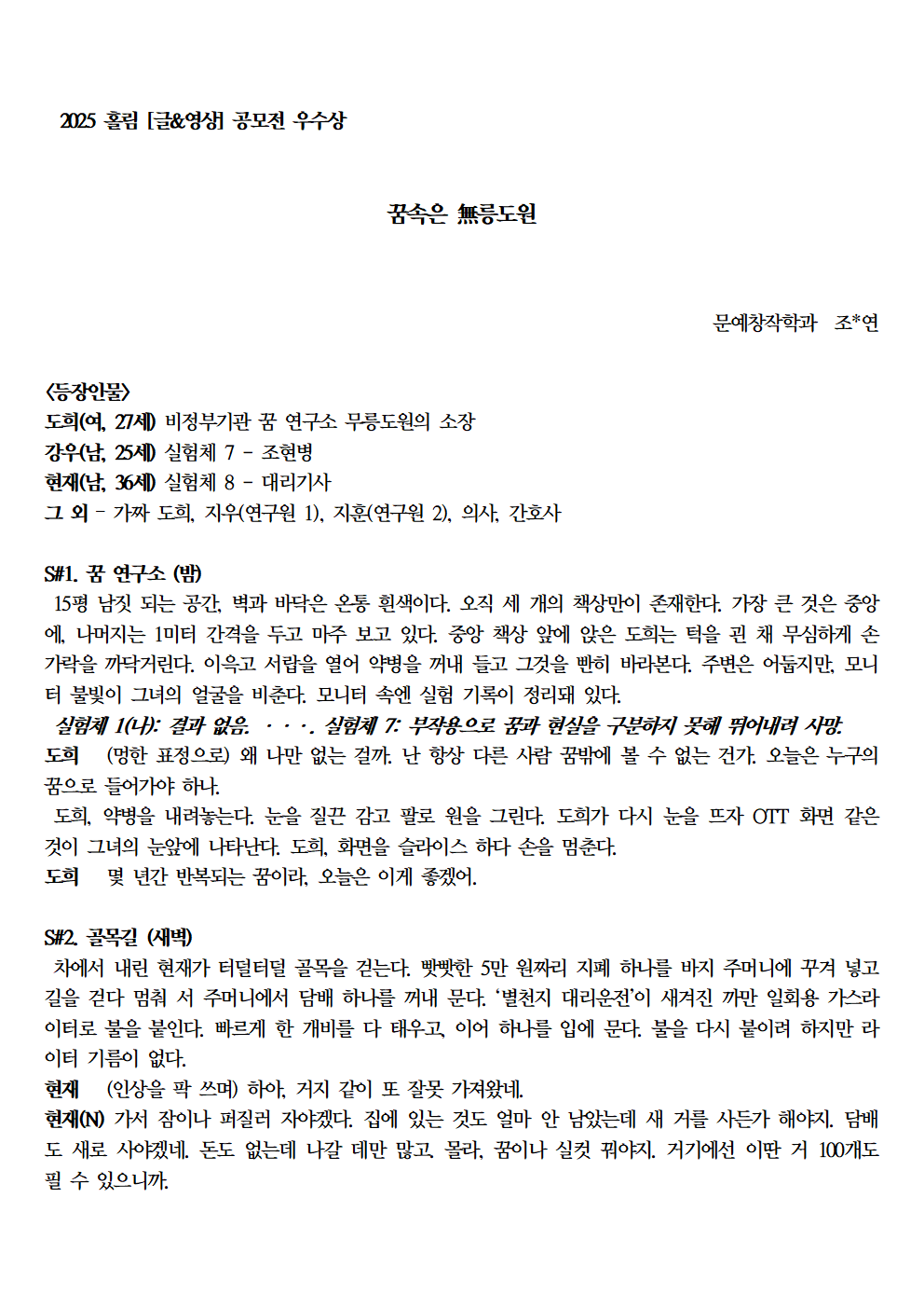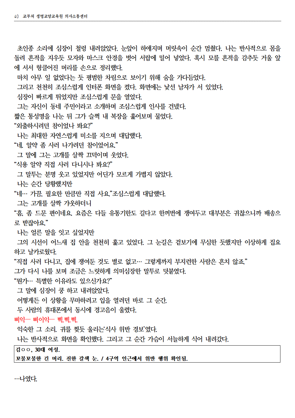 자료실 홈알림마당자료실 2025 홀림 [글&영상] 공모전 우수상 수상 작품 (식사 위반 경보 외) 2025 홀림 [글&영상] 공모전 우수상 수상 작품 (식사 위반 경보 외) 의사소통센터2026-01-23 페이스북 트위터 구글플러스 이메일 프린트 이전자료실다음
