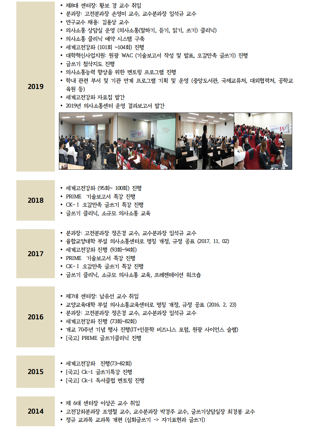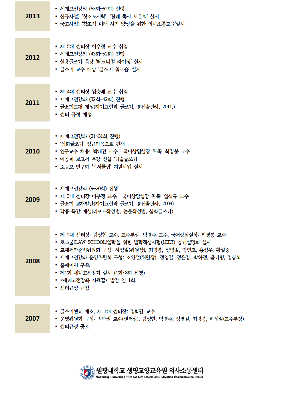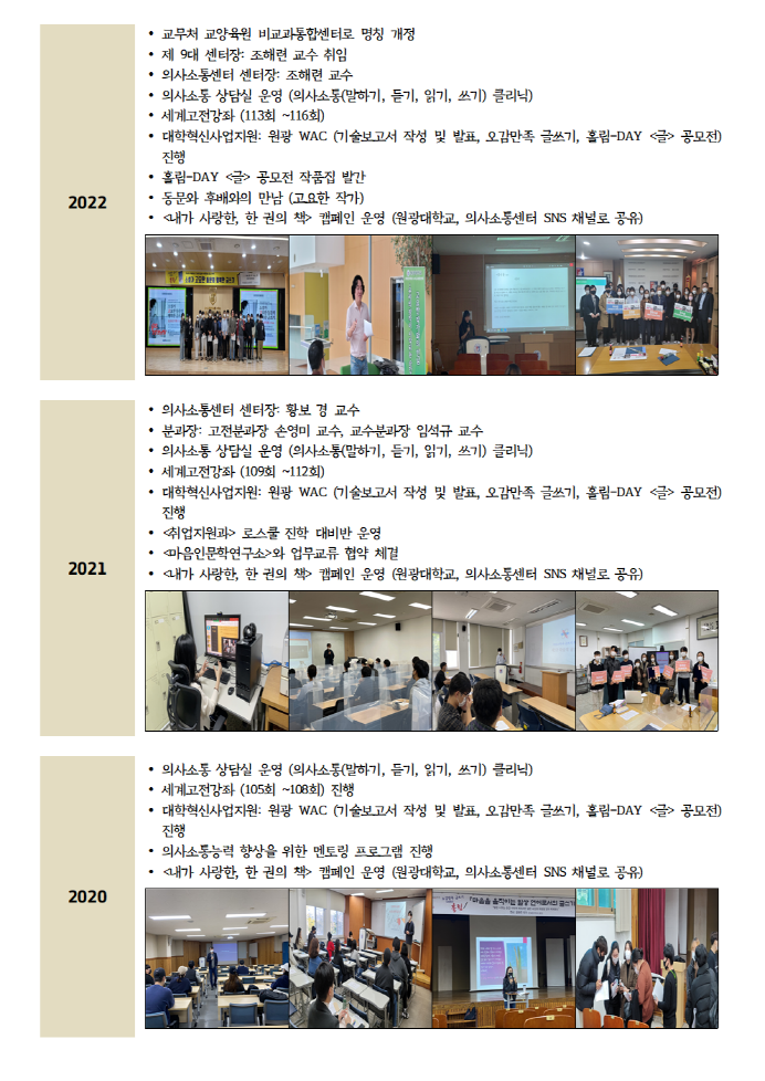생명교양교육원 의사소통센터 연혁 (2007년~2025년) 홈의사소통센터생명교양교육원 의사소통센터 연혁 (2007년~2025년) 콘텐츠 담당부서: 의사소통센터 063) 850-7132